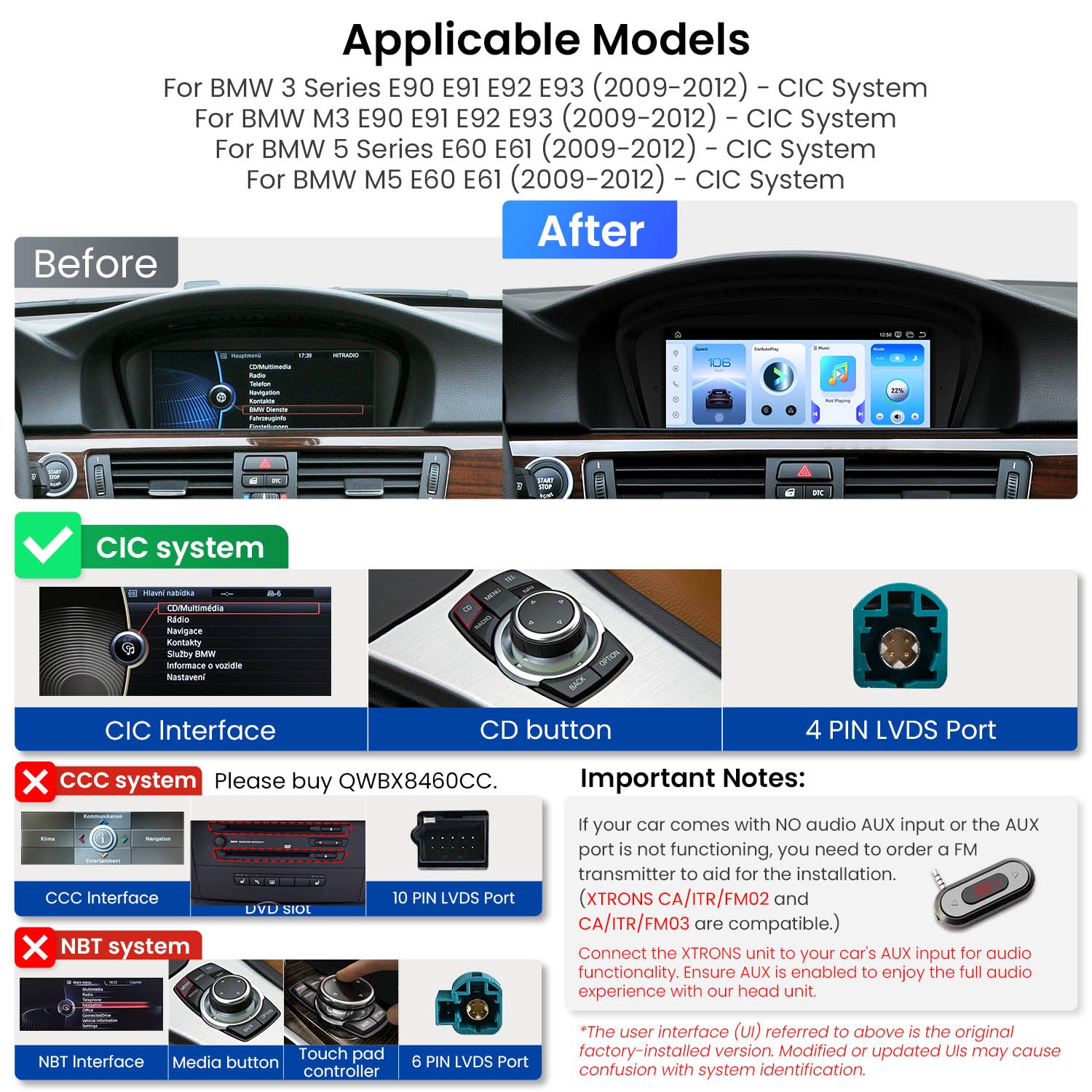 1. This unit ONLY works with the original BMW CIC system. A CIC system car radio usually comes with CD button, a 4-pin LVDS port, a BMW CIC Interface.