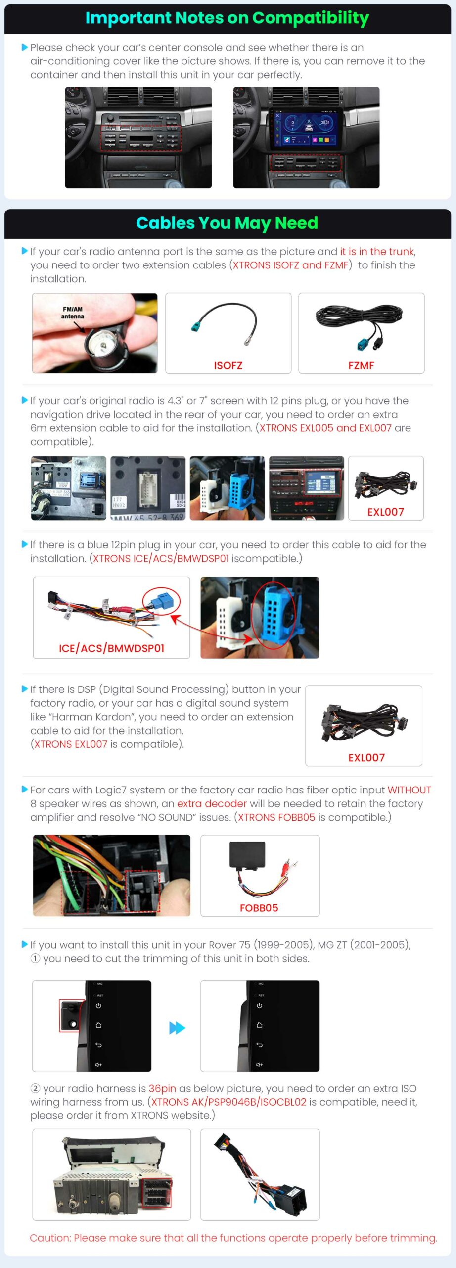 - If you want to install this unit in your Rover 75 (1999-2005), MG ZT (2001-2005), you need to cut the trimming of this unit in both sides. Also, if your radio harness is 36pin, you need to order an extra ISO wiring harness from us. (XTRONS AK/PSP9046B/ISOCBL02 is compatible) Caution: Please make sure that all the functions operate properly before trimming.