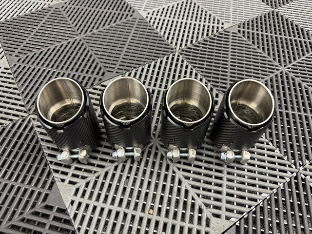 These carbon tips were ordered for Cristian’s E60 M5, and never ended up being used. Please see measurements in photos as well as the part number for reference. Can fit any exhaust if the measurements match up. Clamp on style tips, dry carbon sleeves with stainless construction. MSRP is $650 from Fi.