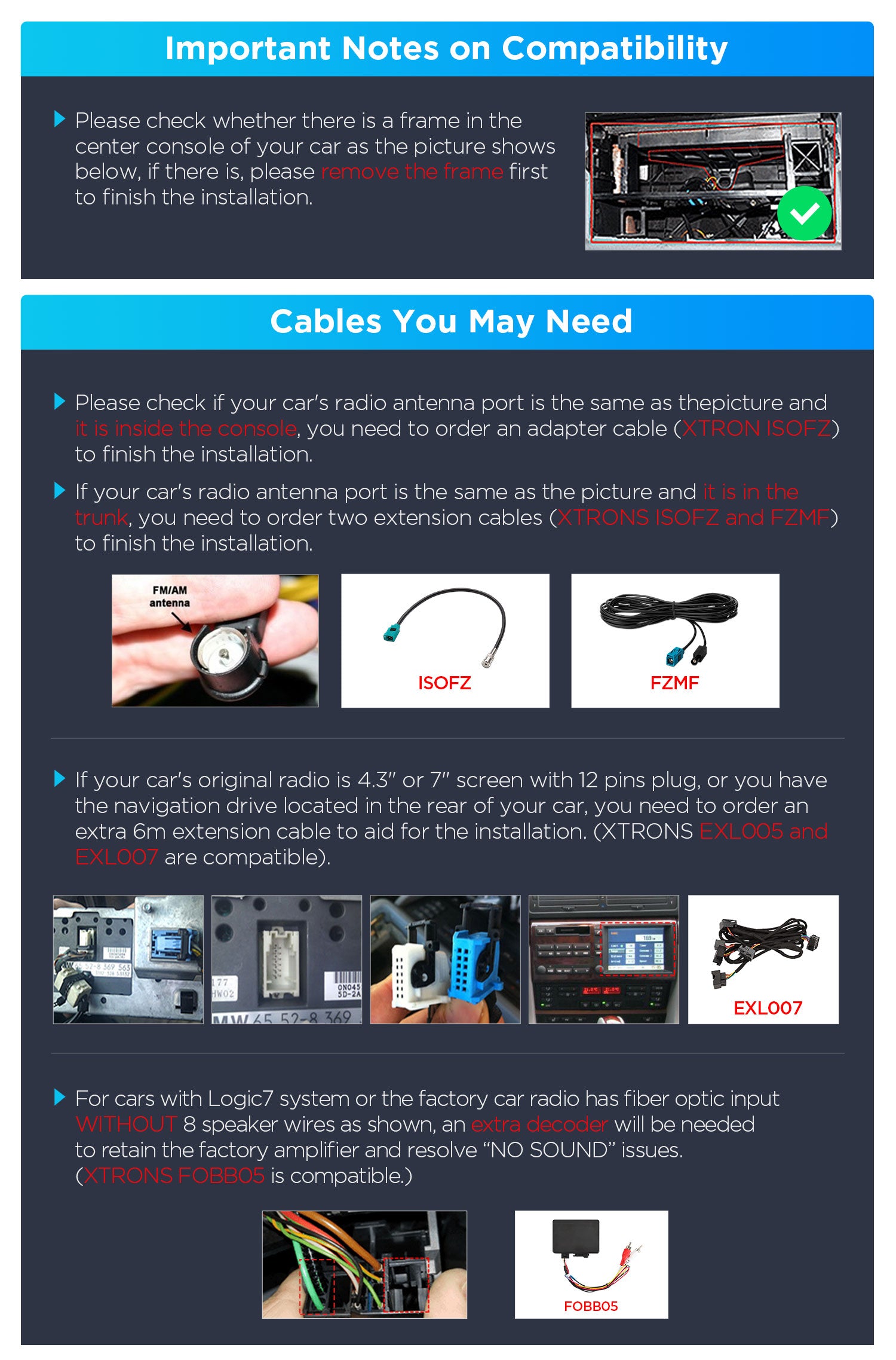 - For cars with Logic7 system or the factory car radio has fiber optic input WITHOUT 8 speaker wires as shown, an extra decoder will be needed to retain the factory amplifier and resolve "NO SOUND" issues. (XTRONS FOBB05 is compatible.)